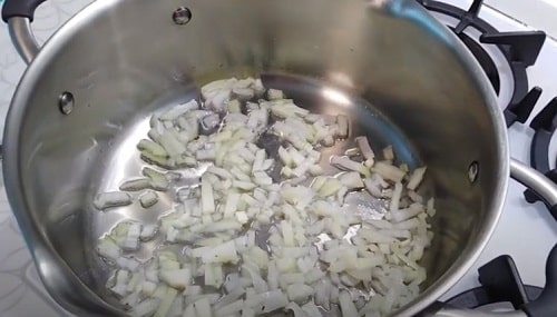 - Нашаткуйте другу цибулину дрібними кубиками, обсмажте в маслі або відразу в каструлі, додавши крапельку масла.