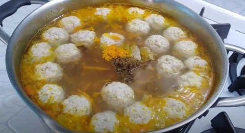 - Зробіть з фаршу фрикадельки. Викладіть в бульйон. Після закипання варіть 10 хвилин.
