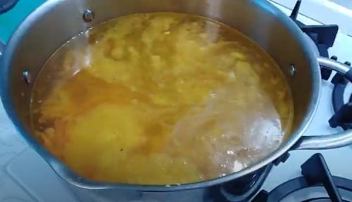 - Залийте в каструлю бульйон. Зачекайте, поки закипить, проваріть п’ять хвилин.