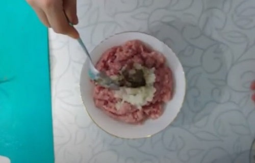 - Відіжміть молоко, покласти у фарш. Підсолити його, поперчіть, додайте подрібнену будь-яким способом цибулину. Вимісити фарш до однорідності.