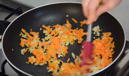 Обжарку почніть з лука, через 2-3 хвилинки покладіть морквяну стружку. Смажте разом до красивої рум’яності.