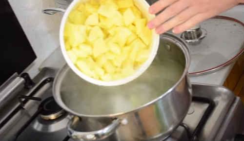 Почистіть картопляні бульби, покришіть великим кубиком. Закиньте в бульйон.