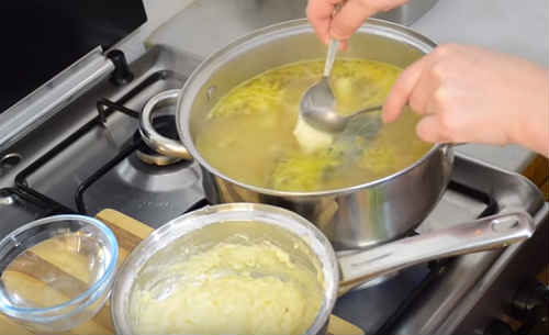 Останній крок – галушки. Робіть їх з допомогою двох маленьких ложечок, буде зручніше. Змочіть їх водою, однією прихопіть трохи тесту, другий допомагаючи скинути його в каструлю.