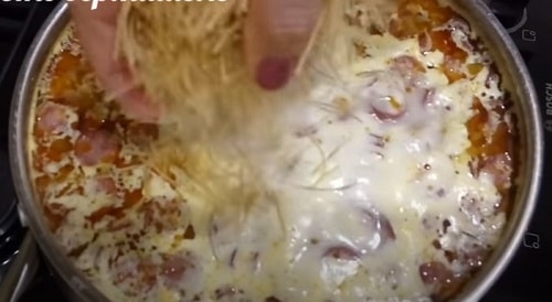 Суп з копченою ковбасою, плавленим сиром і вермішеллю