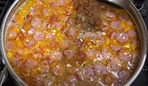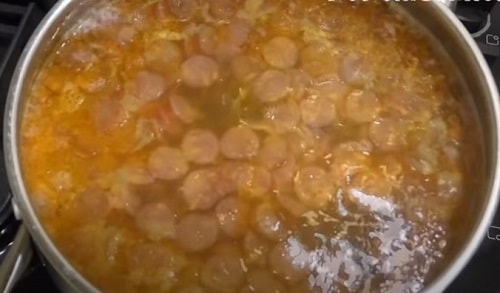Через кілька хвилин додайте в суп ковбаски. Варіть 20 хвилин.