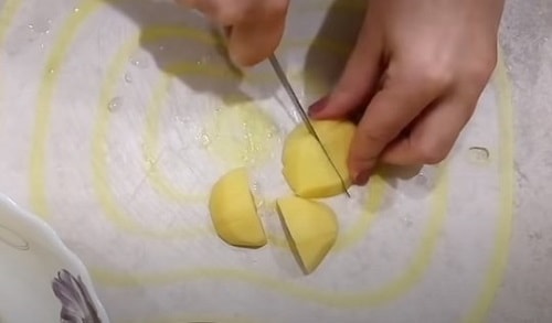 - Поставте воду закипати. Одночасно почистіть і поріжте довільно картопляні бульби. Відправте в каструлю, дайте закипіти. Зменшіть потужність вогню, варіть 10 хвилин.