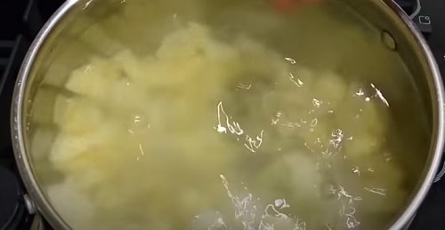 - Закип’ятіть необхідну кількість води, покладіть почищений і подрібнений суповий соломкою картоплю.