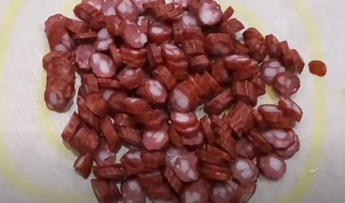 - Крупно наріжте копчену ковбасу, складіть у каструлю з водою. Дочекайтеся закипання, варіть 20 хвилин.