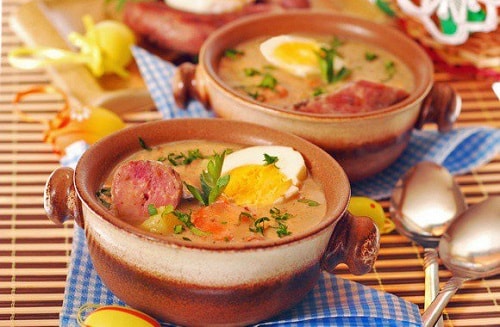 Такий суп обожнюють у Польщі, чомусь називають білим борщем, хоча спільного з нашим традиційним блюдом практично нічого немає. Це суп-пюре з яйцем і краківської ковбасою.