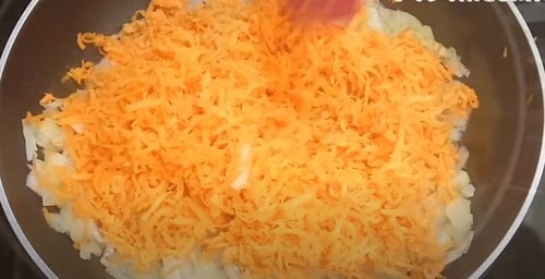 Викладіть моркву, терту на тертці з дрібними отворами. Продовжуйте обсмажувати овочі, часто помішуючи. Коли вони зарум’яняться, вимкніть конфорку.