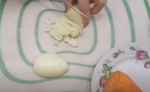 - Паралельно порубаєте часникові часточки, ріпчасту цибулю наріжте півкільцями. Білу частину порею покришіть кільцями.