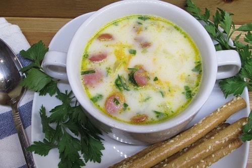 Чудове перше блюдо з плавлених сирків, парочка яких завжди знайдеться в засіках запасливой господині. Рецепт дуже виручить, коли з часом «напруга» і на приготування їжі зовсім немає сил.