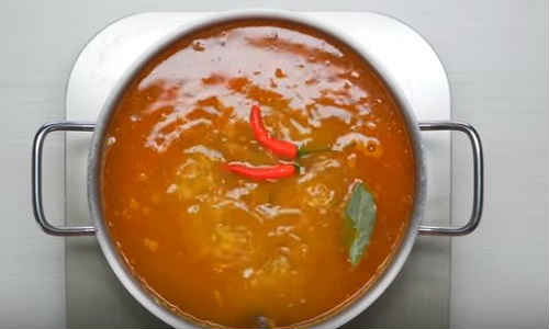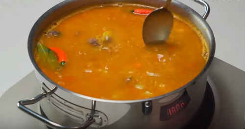 Дайте страві закипіти, додати лаврушку, стручки червоного перцю (цілком). Спробуйте суп на сіль, відрегулюйте смак, якщо знадобиться.