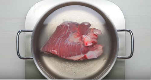 Обполосніть шматок м’яса, складіть у каструлю, залийте холодною водою. Доведіть до закипання на сильному вогні. Зніміть з’явилася піну, зменшіть вогонь. Варіть приблизно годину при тихому булькання.
