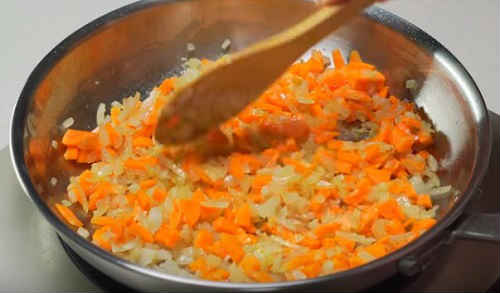 - Паралельно обсмажте в маслі подрібнені моркву з цибулею.