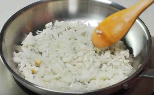 Пропустіть через прес зубчики часнику, відправте смажитися до цибулі.