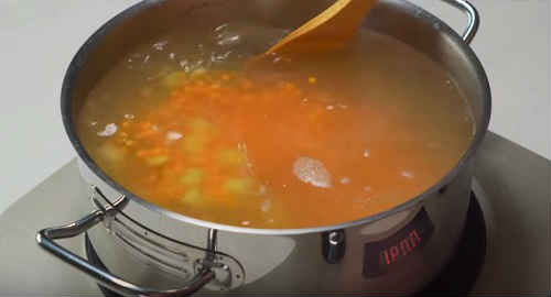 - Влийте бульйон, додайте сочевицю. Коли суп закипить, зменшіть потужність вогню. Томіть при слабкому кипінні 20 хвилин. Після дайте страві трохи охолонути, і пробийте компоненти блендером, перетворивши в пюре.