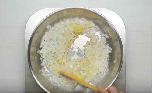 - Нашаткуйте цибулю, обсмажте у вершковому маслі на сковороді. Закиньте щіпку куркуми, перемішайте. Засипте борошно, знову старанно перемішайте вміст.