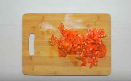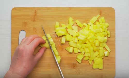 - Овочі почистіть, наріжте картоплю з морквою великими кубиками. Також настрогайте м’якоть солодкого перцю.