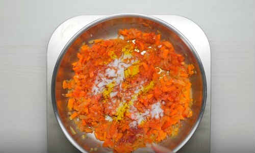 Через хвилинку інтенсивного помішування відправте смажитися морквину. Готуйте овочі ще пару хвилин.