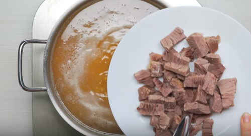 Швидко поділіть м’ясо невеликими шматочками, відправте в каструлю.
