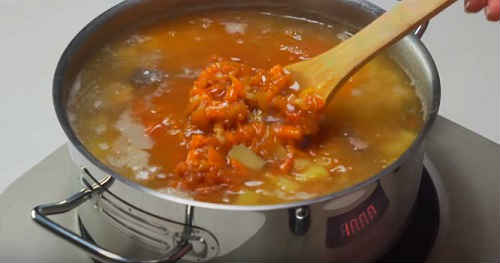 - Промити сочевицю, складіть у каструлю, залийте водою. Коли суп закипить, додати засмажку з сковороди. Варіть на малому вогні 15 хвилин.