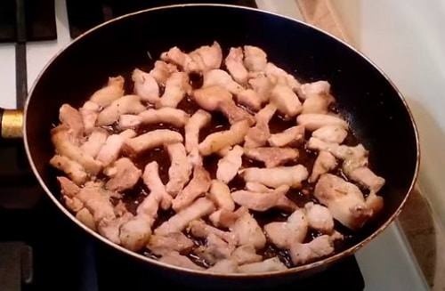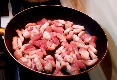 - Викладіть в розпечене масло. Якщо берете сало, кладіть його на даному етапі, дрібно порізавши кубиками. Іноді сало закладають на сковорідку перед м’ясом, витоплюють його, потім витягують і кладуть свинину. Обидва способи рівноправно хороші.