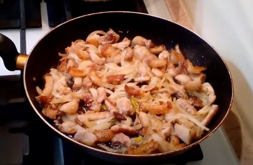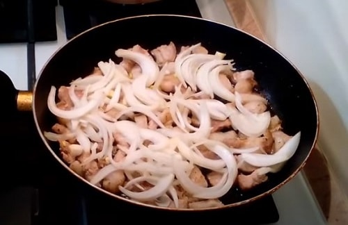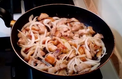 - Викладіть смажену м’якоть, замість неї закладіть цибулю. Додайте ще трохи жиру. Коли цибуля стане прозорою, додати соломку болгарського перцю.