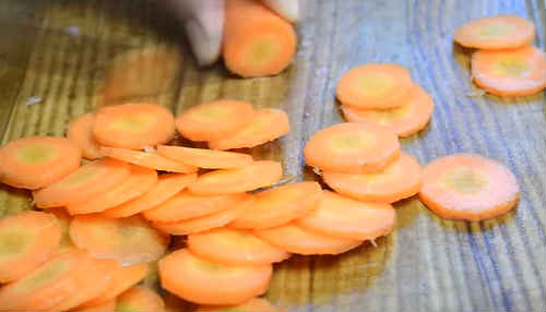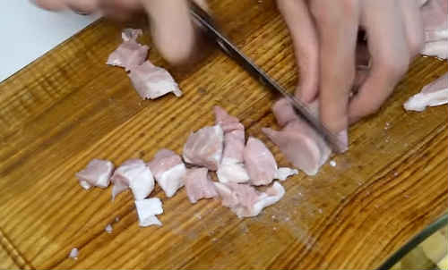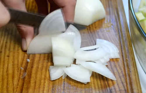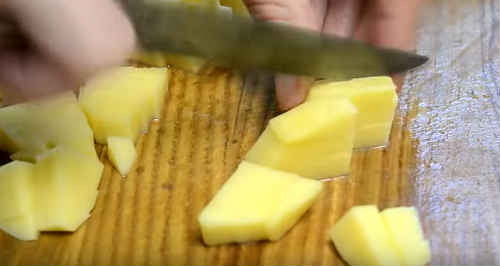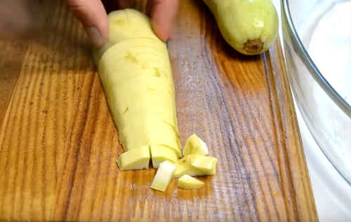 Можна робити довільну нарізку овочів, але краще приблизно однаковими кубиками і кільцями. Поділіть кабачки кубиками середнього розміру. Якщо овоч молочної стиглості, насінну частину припустимо залишити.