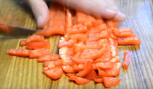 У солодкого перцю видаліть насіння з перегородками, покришіть короткою соломкою.