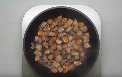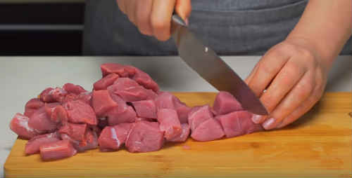Вирізку наріжте кубиками середнього розміру.