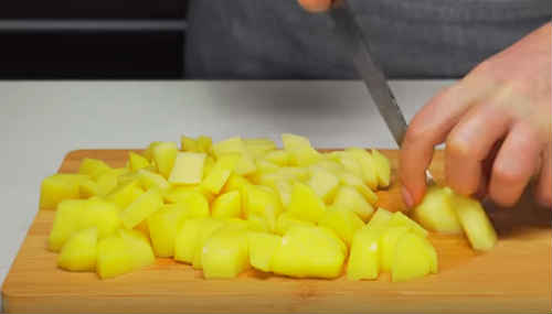 Обполосніть бульби картоплі, почистіть, покришіть кубиками. Розмір нарізки визначте самі. Я ділю не дуже крупно, але і дрібнити теж не варто.