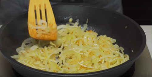 Полоните на сковороду пару ложок соняшникової олії, викладіть цибульну нарізку. Смажте близько 5 хвилин, не перестаючи помішувати.