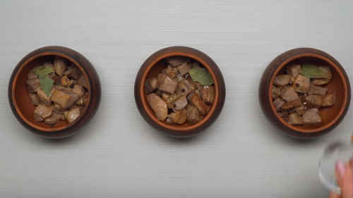 Розділіть м’ясо по горщикам в рівній кількості.