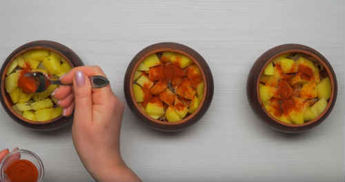 Поверх покладіть картоплю, наповнивши горщики майже доверху.