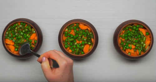Наріжте півкільцями моркву. Закиньте в горщик, місце, що залишилося заповніть сумішшю замороженого горошку з квасолею. Якщо чогось не знайдеться, не губіться, замініть будь-якими овочами.