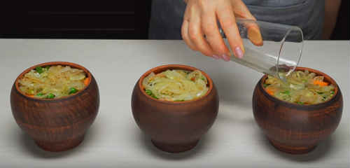Зверху розподіліть залишки лука. Влийте бульйон або просту воду, накрийте кришками і поставте в духовку на середній рівень. Зверніть увагу, що вода не повинна повністю покривати інгредієнти, оскільки овочі розваряться і осядуть. Температура в печі 180 про С. Час приготування – годину.