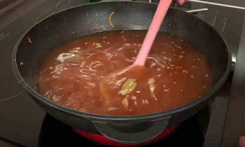 У сковороду, де тушкувалося м’ясо з овочами, викладіть томатний соус, залийте близько 2 літрів води. Раджу закип’ятити її заздалегідь. Додайте лавровий листок, сіль, перець. Спробуйте заливку на смак, підкоригуйте на сіль і прянощі.