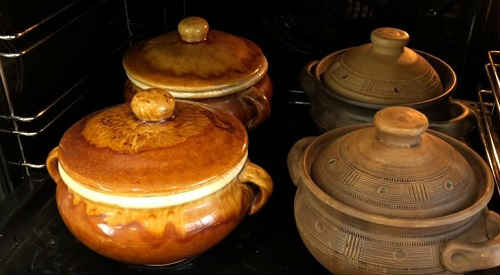 Поставте в духовку, прогріту до 180-200 С (залежить від потужності вашої печі і розміру горщиків). Тушкуйте спекотне 45-50 хвилин.