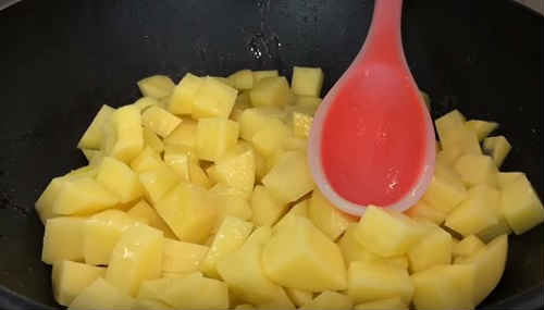 Почистіть картоплю, наріжте великими кубиками. Перекладіть в розігріте масло на сковороду. Обсмажте на сильному вогні до красивої рум’яності. До готовності нарізку смажити не потрібно, оскільки далі чекає тривале гасіння. Наша мета – скоринка, але сильно не засмажуйте. В процесі трохи підсолити картоплю.