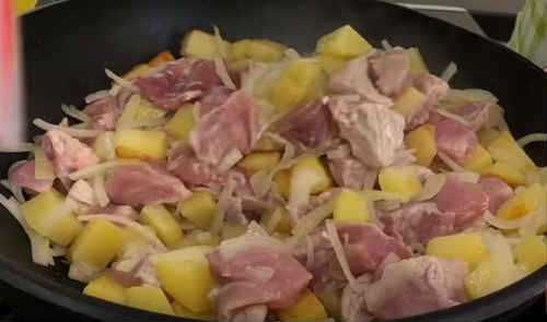 Наріжте свинину кубиками, відповідними картоплі.