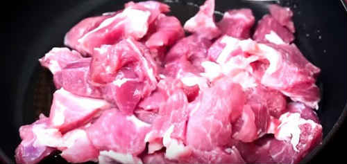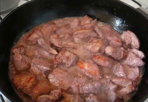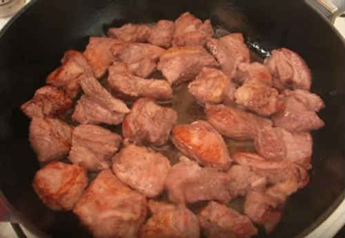 - Розжаримо на сковорідці масло, покладіть м’ясні шматочки, смажте до випарювання рідини.