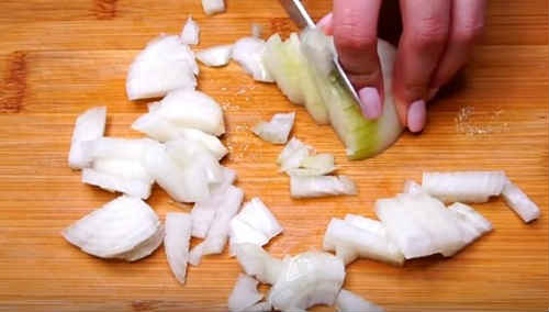 - Паралельно почистіть овочі. Цибуля шинкуйте кубиками, моркву потріть великої стружкою.