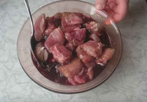 Дістаньте м’ясо, старанно відіжміть від маринаду. Рідина не виливайте, вона нам знадобиться.