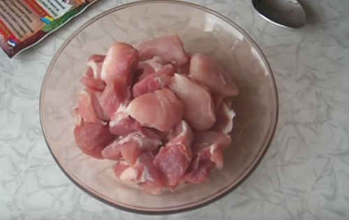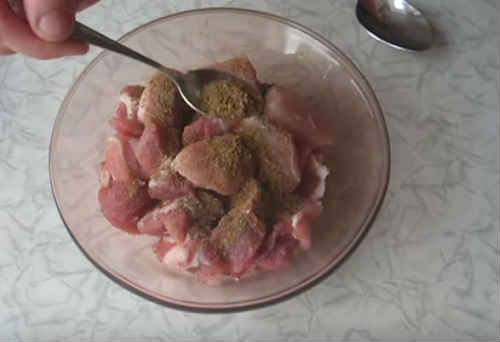 - Поділіть вирізку шматочками середнього розміру, трохи відбийте, якщо вони досить великі. Підсолити, посипте сумішшю перців, перемішайте.