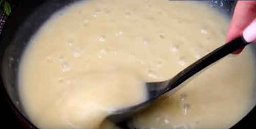 - Викладіть майонез і гірчицю в мисочку, розведіть гарячою водою. Вилийте соус на сковороду.