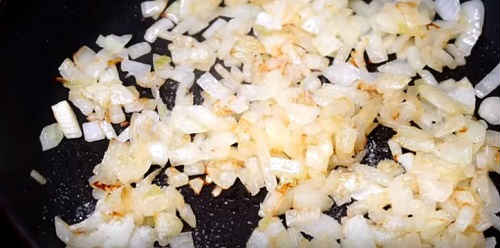 - Наріжте цибулю півкільцями. Підрум’яньте в невеликій кількості олії, зробивши помірний прогрів.