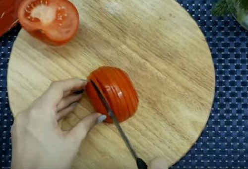 Поділіть помідори на половинки, наріжте півколами.