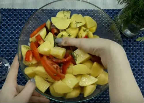 - Складіть овочі в окрему миску, перемішайте, засипте травками, влийте масло, роздушіть часник. Знову старанно перемішайте вміст.