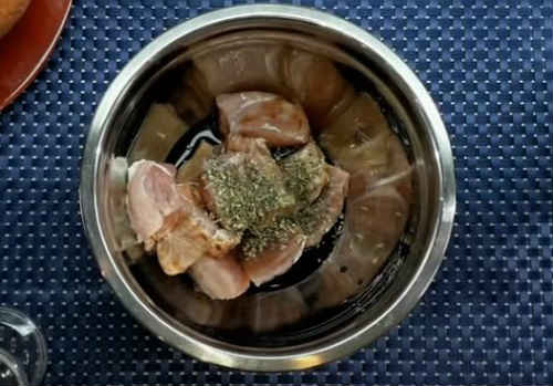 - Налийте в миску 3 ложки олії, видавіть туди часникові зубки, додайте розмарин, коріандр, хмелі-сунелі, підсолити. Ретельно розітріть маринад.